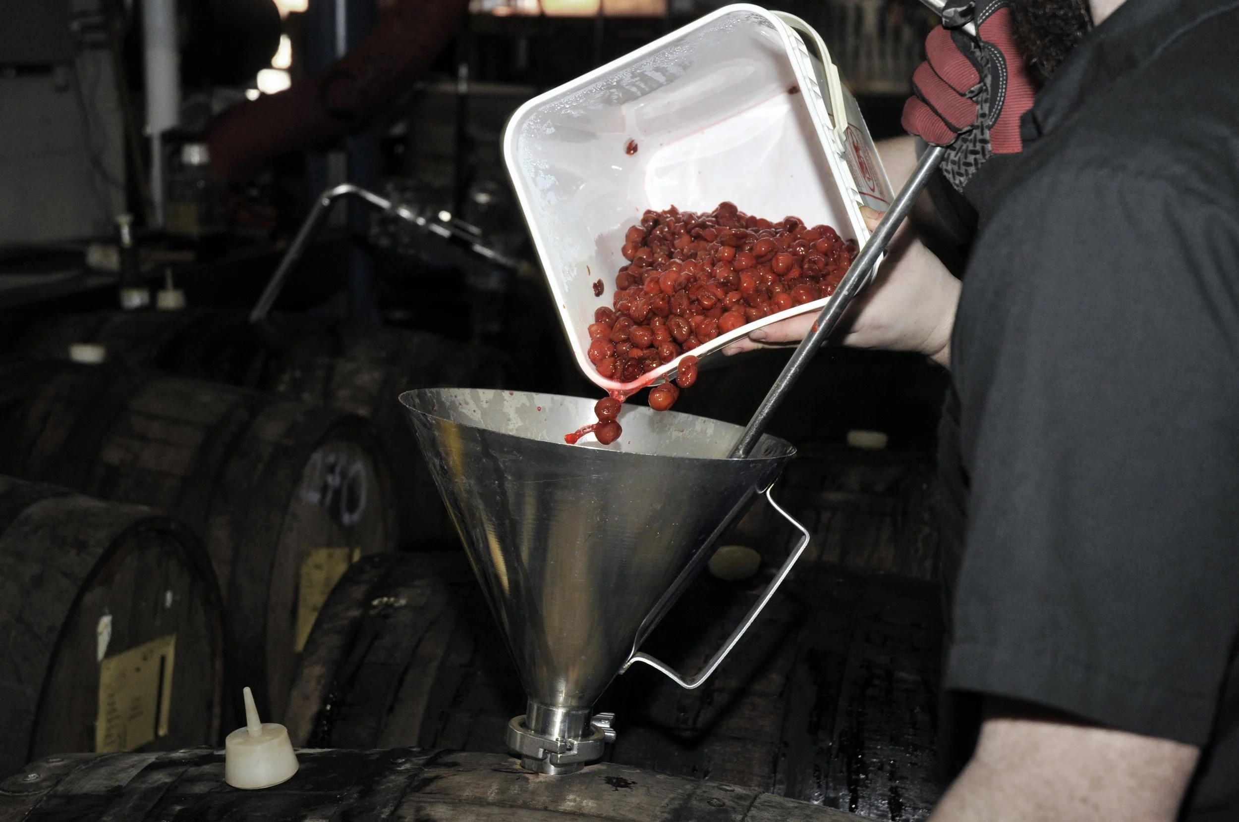 Adding the sour cherries to the barrel